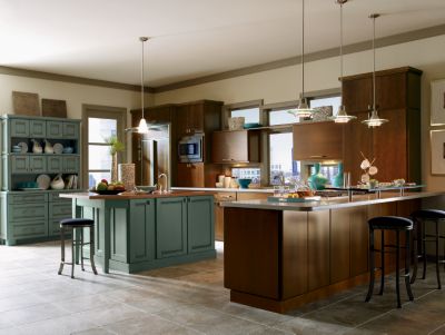 | Thomasville Cabinetry's Marine finish paired with Cove on Maple is a great way to accent your kitchen with a splash of color. You can use it as your full kitchen, or as an island or hutch as they did in this design. |